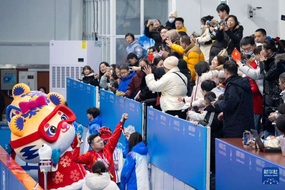 2月5日,第九屆亞冬會(huì)吉祥物與觀眾互動(dòng)。