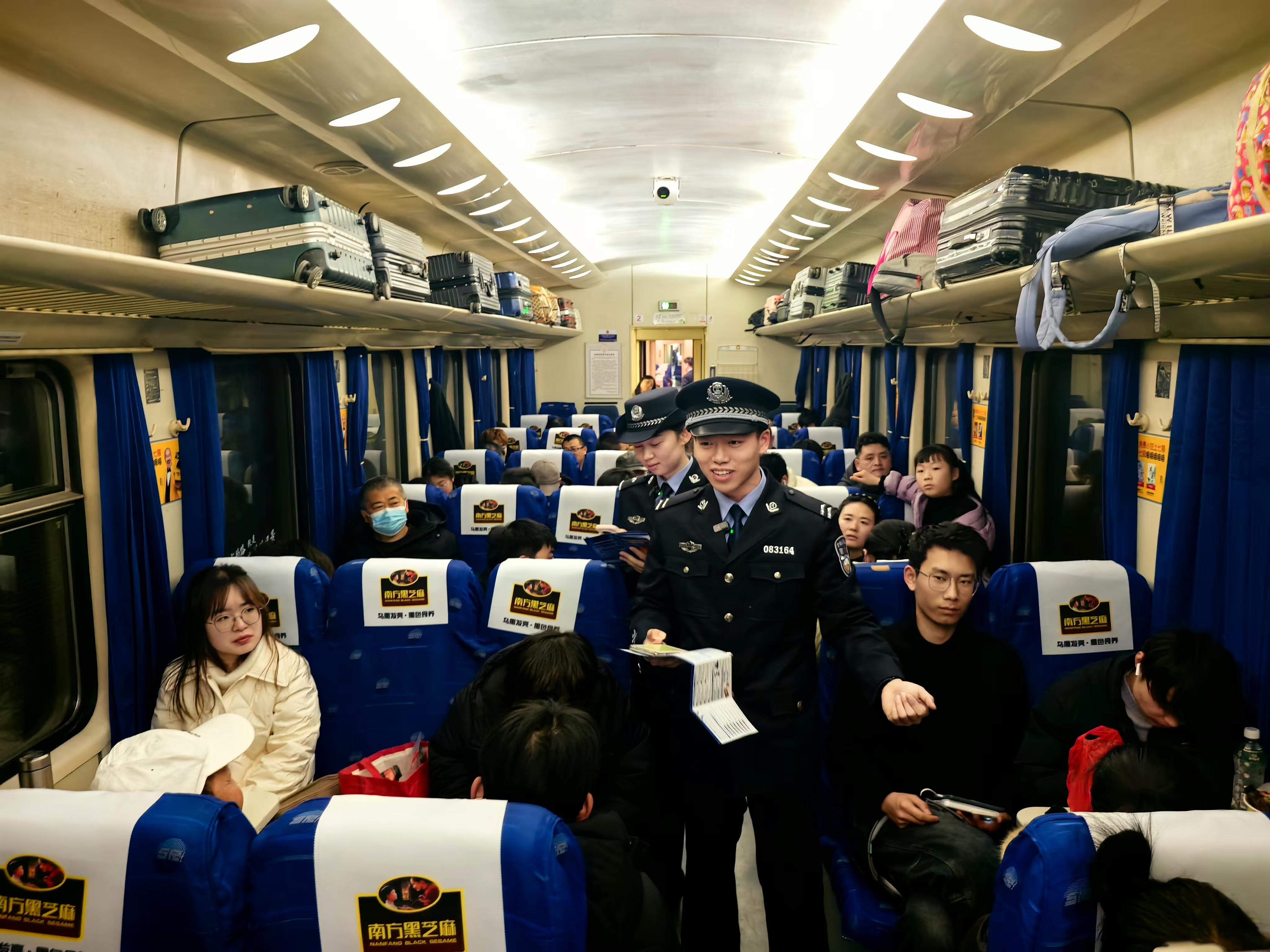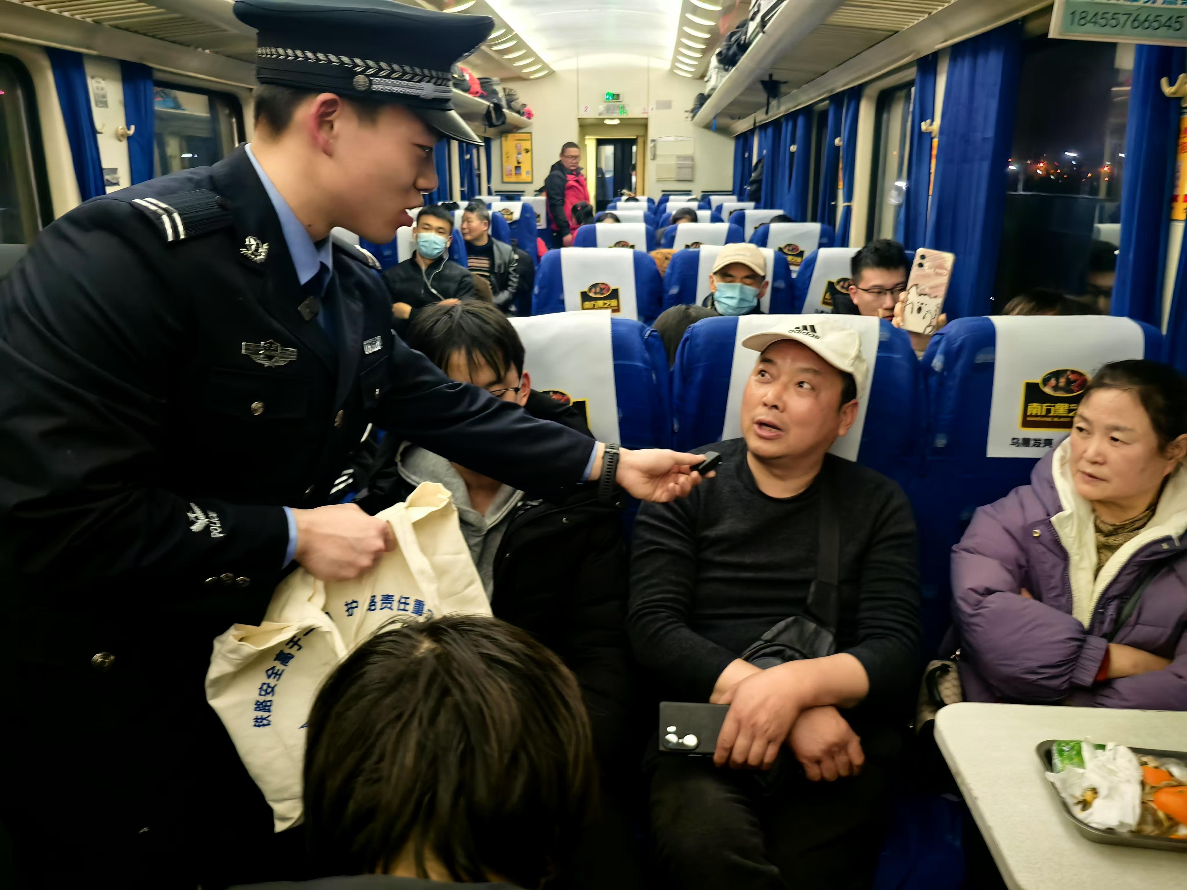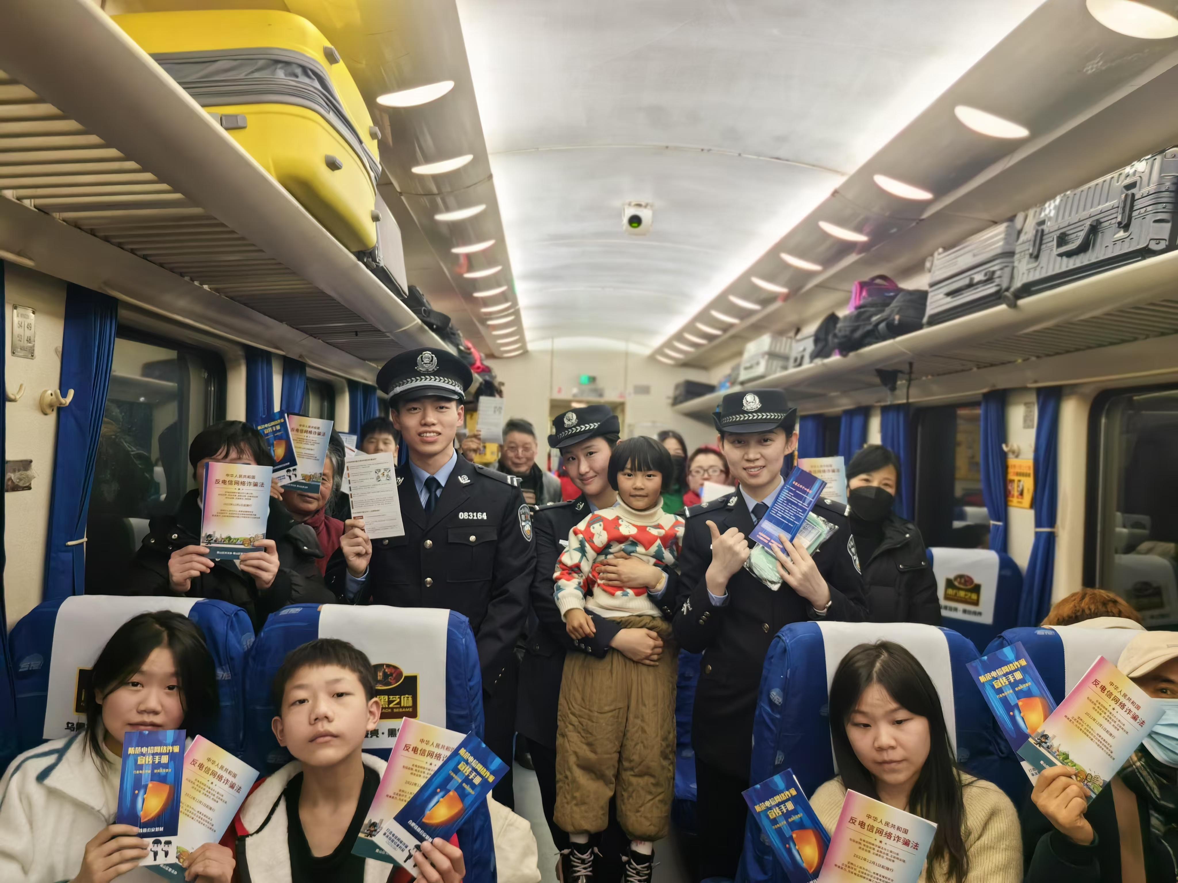 圖為民警在車(chē)廂里向旅客講解如何防范電信網(wǎng)絡(luò)詐騙。