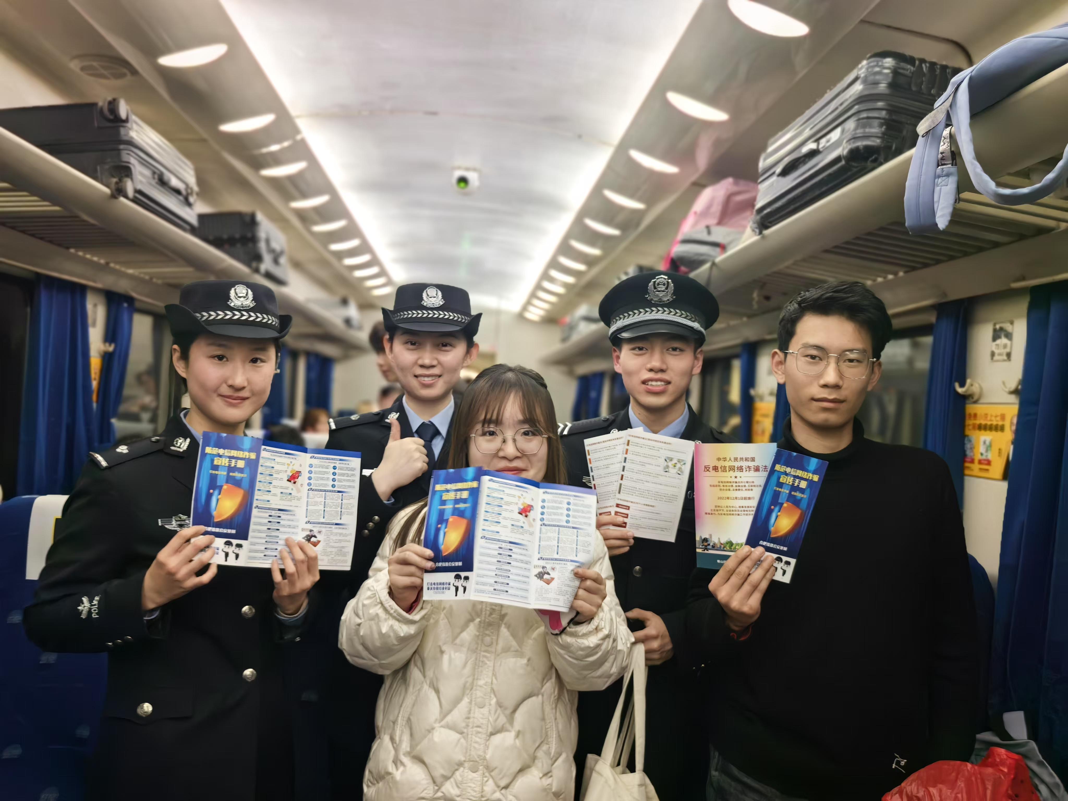 圖為民警與旅客手舉防范電信網(wǎng)絡(luò)詐騙宣傳手冊(cè)合影留念。