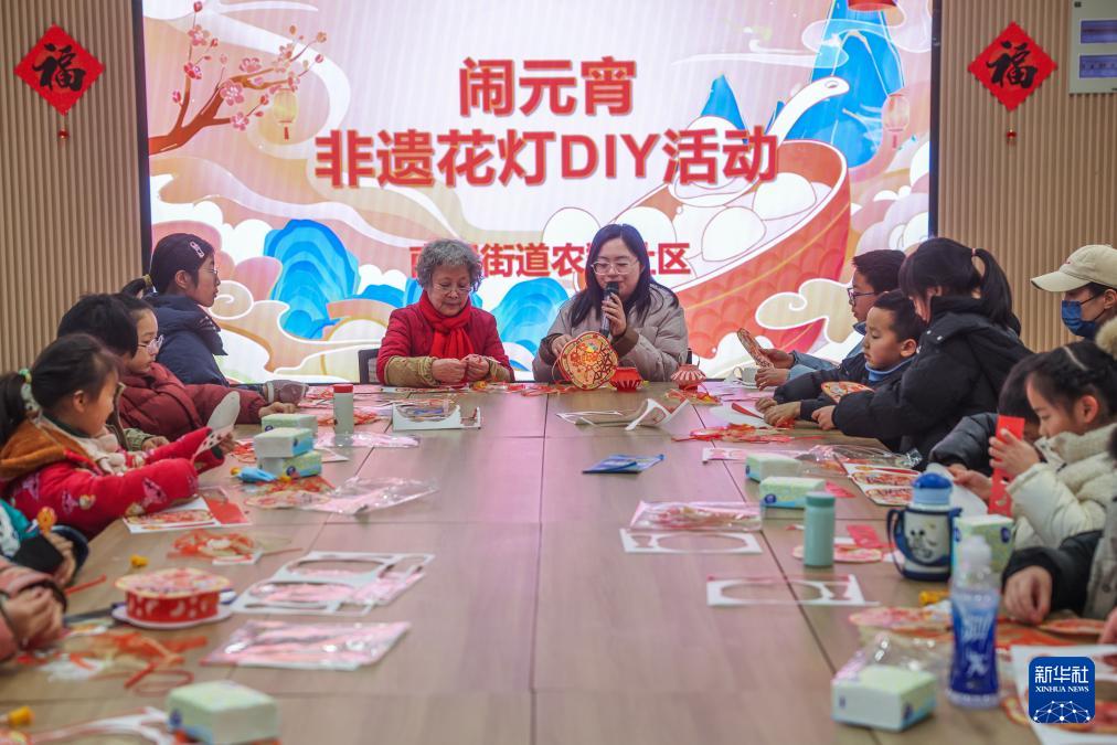 2月6日,嘉興市南湖區(qū)南湖街道農(nóng)翔社區(qū)的志愿者帶領居民一起做元宵花燈。