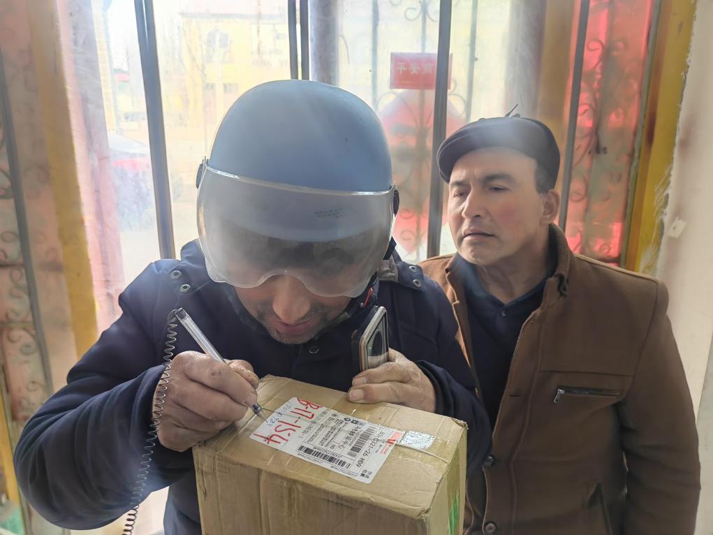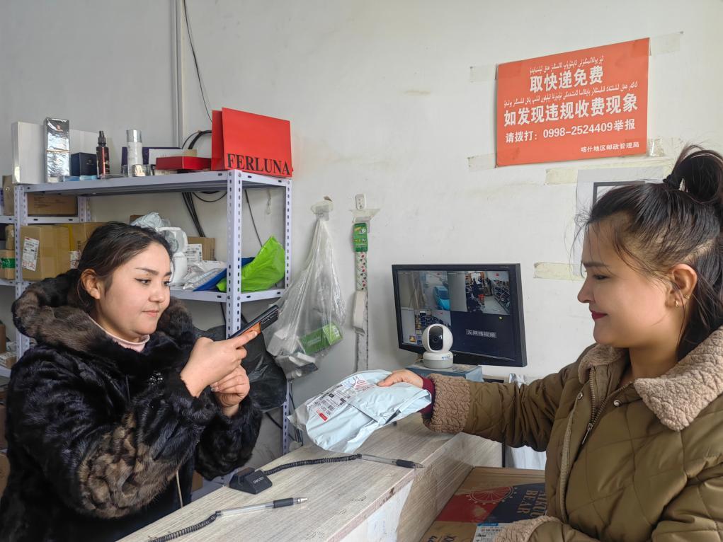 1月18日,在新疆喀什市荒地鄉(xiāng)一快遞代收點,負責人塔吉尼沙·買買提力(左一)在為顧客掃描快遞單號。新華社記者蔡國棟 攝