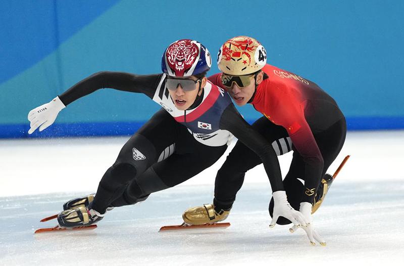 2月9日,中國隊(duì)選手林孝埈(右)、韓國隊(duì)選手樸智元在比賽中發(fā)生身體碰撞。新華社記者 顏麟蘊(yùn) 攝