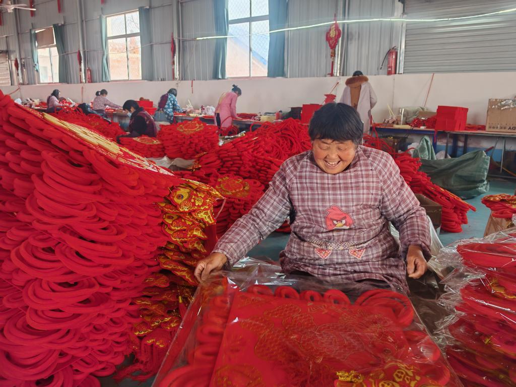 新華社鄭州2月8日電(記者吳剛)春節(jié)假期剛過(guò),河南省鄧州市陶營(yíng)鎮(zhèn)王良村的工廠車間里已是一派繁忙景象。62歲的村民胡選霞手指翻飛,一根紅繩在她掌心穿梭,不到3分鐘便編出一枚精巧的中國(guó)結(jié)。這樣的手工結(jié),她每天能完成200多個(gè),月收入超3500元,“比俺種幾畝地掙得多哩!”