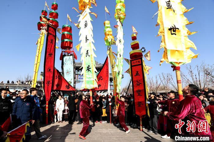 圖為2月9日,霸州市勝芳古鎮(zhèn)花會活動現(xiàn)場中幡會表演。賈珺 攝