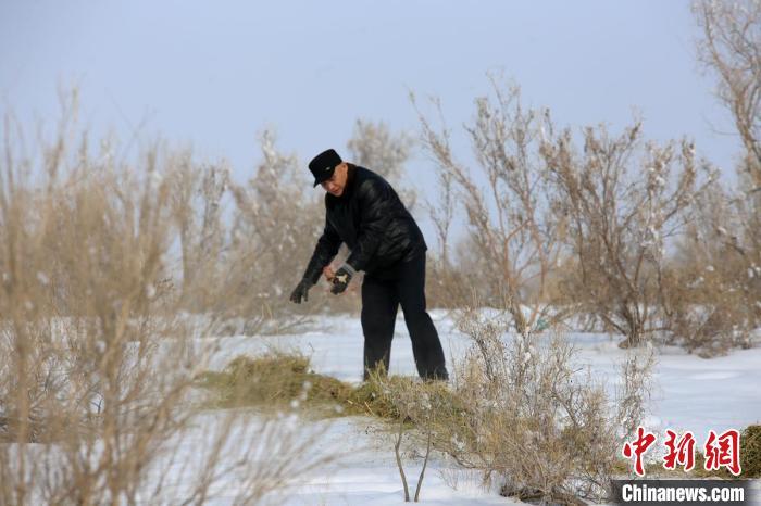 近日,護林員王偉踏著厚厚的積雪,與同事們行走在公益林腹地,為沙漠中的野生動物投放草料。