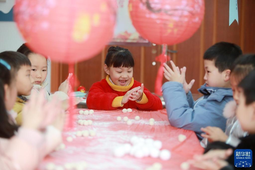 2021年2月24日,在江蘇省揚州市杉灣花園社區(qū),小朋友動手包湯圓。新華社發(fā)(孟德龍 攝)