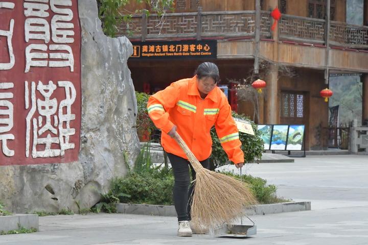 圖為冉友瓊在龔灘古鎮(zhèn)北門(mén)廣場(chǎng)打掃清潔。(受訪者供圖)