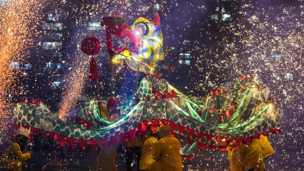2月11日晚,人們?cè)谂_(tái)江縣參加“舞龍噓花”活動(dòng)。新華社記者 陶亮 攝