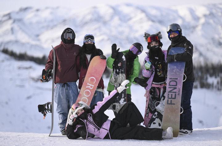2025年1月28日,來自浙江的“95后”姑娘張琦彬(前)與一起滑雪過年的同伴們在新疆阿勒泰將軍山國際滑雪度假區(qū)合影。新華社記者 胡虎虎 攝