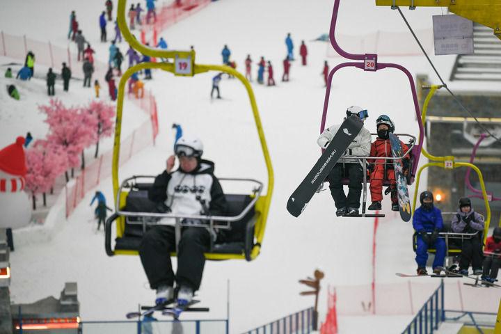 2025年1月12日,在成都熱雪奇跡室內(nèi)滑雪場,滑雪愛好者搭乘索道前往高級道。新華社記者 胥冰潔 攝