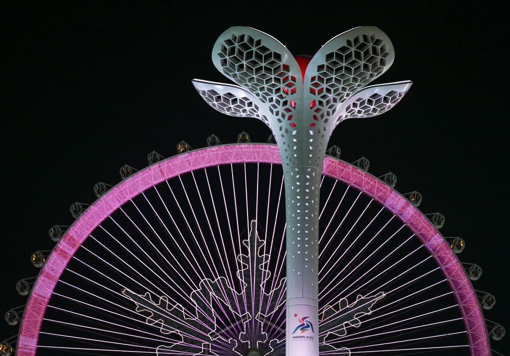 當(dāng)喧囂的賽場漸漸沉寂,當(dāng)忙碌的身影停下腳步,開幕式上的巨型冰燈返場,鏡頭來到分會場。夜空之下,冰雪大世界里,雪花摩天輪前,亞冬圣火緩緩熄滅,絢麗燈光灼灼其華。
