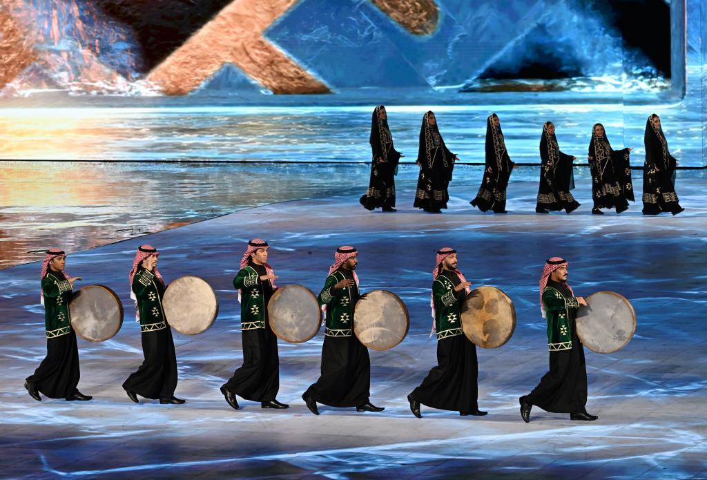 作為下一屆亞冬會舉辦城市,來自沙特阿拉伯未來新城的文藝表演舞姿曼妙,鼓點歡快,洋溢著濃郁的西亞風(fēng)情。頃刻間,整個舞臺化作冰雪運動場,光影穿梭的運動員號召著下一次相約,在現(xiàn)場掀起新的高潮。