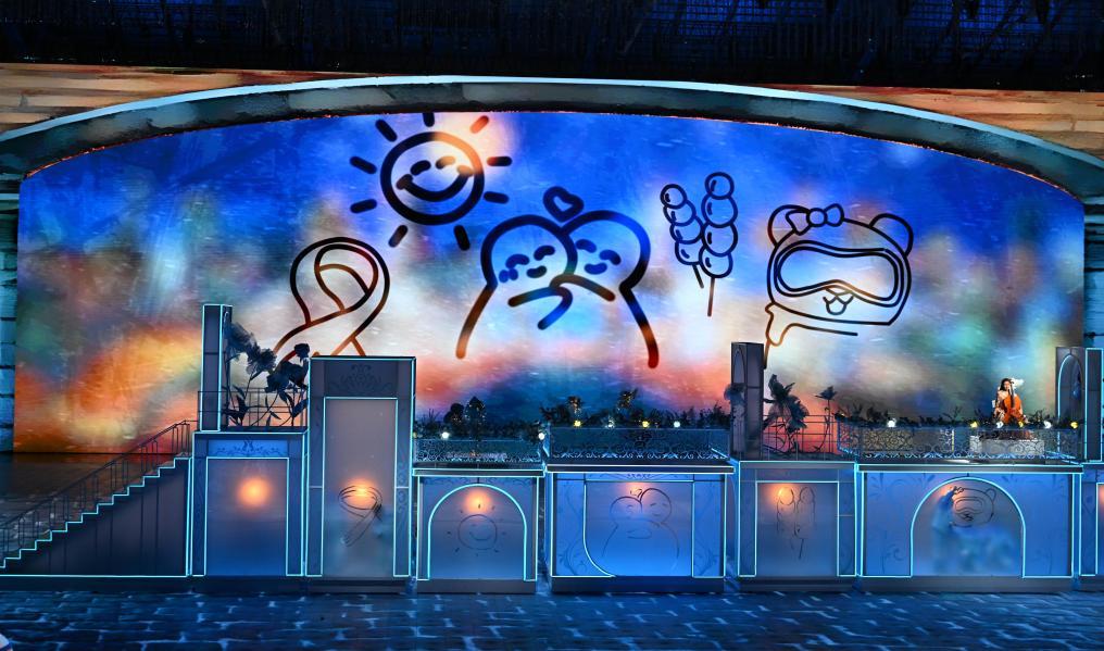 舞臺上,當(dāng)現(xiàn)場舞者與虛擬樂團交相呼應(yīng),閉幕式演出震撼開場。身穿橘黃紗裙的舞者翩然,宛如冰凌花朵朵綻放。可愛的“雪人”舞動全場,仿佛雪山的精靈帶來捷報。