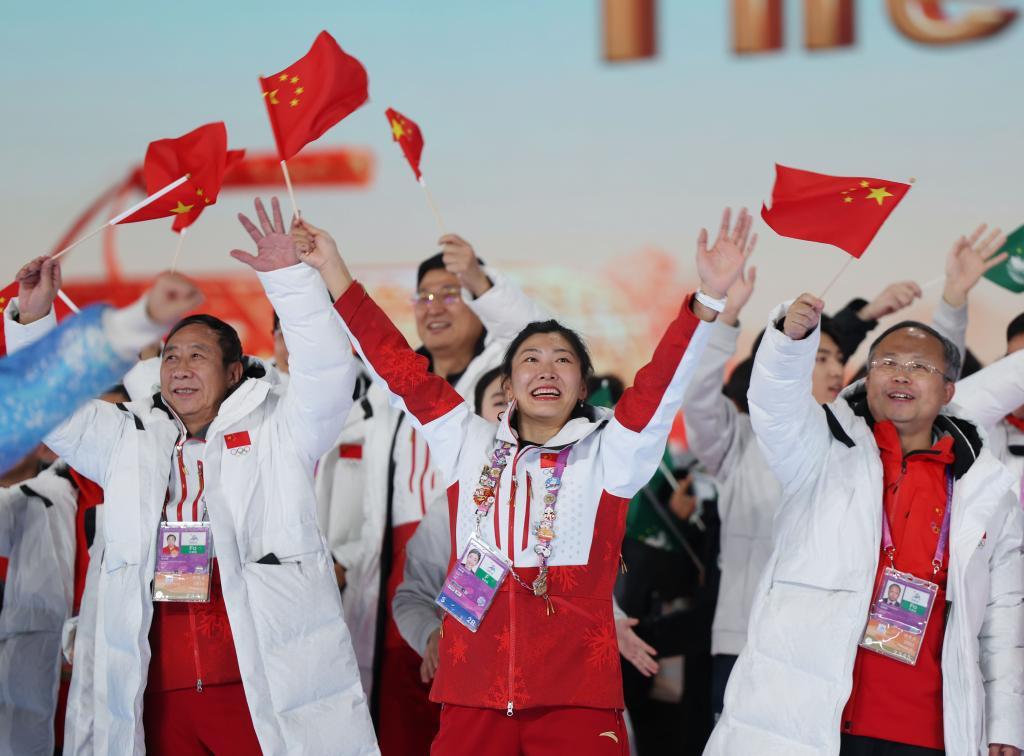 2月14日,中國體育代表團(tuán)旗手徐夢(mèng)桃(中)在亞冬會(huì)閉幕式上。新華社記者 張濤 攝