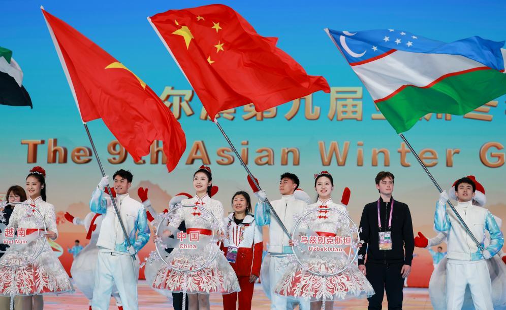 2月14日,第九屆亞洲冬季運(yùn)動(dòng)會(huì)閉幕式在哈爾濱舉行,這是各體育代表團(tuán)入場環(huán)節(jié)。新華社記者 許雅楠 攝