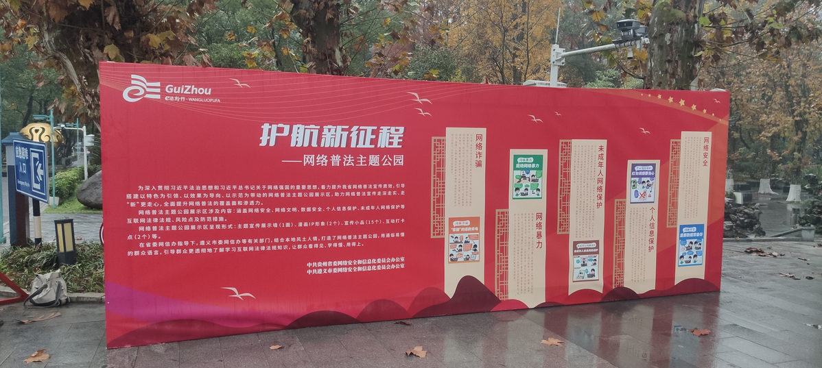 遵義市委網(wǎng)信辦依托遵義紀(jì)念公園打造網(wǎng)絡(luò)普法主題公園,展示涵蓋網(wǎng)絡(luò)安全、網(wǎng)絡(luò)文明、網(wǎng)絡(luò)詐騙、網(wǎng)絡(luò)沉迷、數(shù)據(jù)安全、個(gè)人信息保護(hù)、未成年人網(wǎng)絡(luò)保護(hù)等互聯(lián)網(wǎng)法律法規(guī),以主題宣傳展示墻、漫畫IP形象、宣傳小品及互動(dòng)打卡點(diǎn)等形式進(jìn)行普法宣傳。