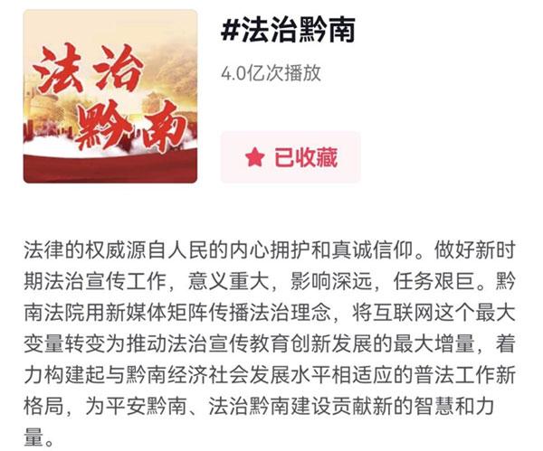 “網(wǎng)言網(wǎng)語”,提升品牌效應(yīng)。黔南中院積極擦亮“法治黔南”普法品牌,制作發(fā)布以案釋法、違法犯罪警示等短視頻作品,抓住和深耕社會熱點,主動“傍”熱點普法,讓網(wǎng)民愿聽、想聽,滿足受眾的“信息需求”。截至目前,“法治黔南”短視頻普法話題在抖音平臺播放量超4億次。數(shù)字的背后,是一條條普法視頻從“圈內(nèi)”走向“圈外”,是一次次在“出圈破圈”中“吸粉引流”。
