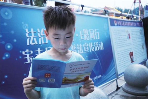 普法活動現(xiàn)場,小朋友閱讀發(fā)放的《中華人民共和國國家安全法》宣傳手冊