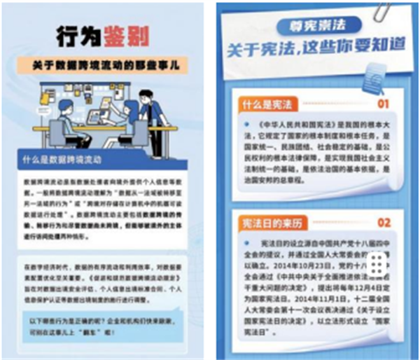 圍繞重點(diǎn)法規(guī)、重要時(shí)間節(jié)點(diǎn),做好權(quán)威內(nèi)容轉(zhuǎn)化,推出多形式的法宣產(chǎn)品、交互活動(dòng),從單向式教育向互動(dòng)式、服務(wù)式、場景式傳播轉(zhuǎn)變。