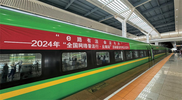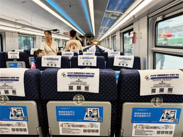 一是打造主題車廂。聚焦“一帶一路”網(wǎng)絡(luò)空間安全和沿線群眾在網(wǎng)絡(luò)法治領(lǐng)域的熱點(diǎn)問題,根據(jù)復(fù)興號CR200J的車型特點(diǎn),設(shè)置“中國網(wǎng)絡(luò)法治三十年”“網(wǎng)絡(luò)安全”“數(shù)據(jù)安全”“未成年人網(wǎng)絡(luò)保護(hù)”“數(shù)據(jù)出境之旅”“反網(wǎng)暴凈網(wǎng)行動(dòng)”“個(gè)人信息守護(hù)”以及“網(wǎng)絡(luò)空間命運(yùn)共同體”8節(jié)主題車廂,讓車廂內(nèi)部成為網(wǎng)絡(luò)普法移動(dòng)走廊,突出展示新時(shí)代中國網(wǎng)絡(luò)法治建設(shè)理念、實(shí)踐成效及交流成果。二是豐富法治內(nèi)容。充分利用車廂內(nèi)鏡框海報(bào)、玻璃貼、小桌板貼、行李架彩貼、頭枕片、LED顯示屏等豐富多彩的載體,以口訣、順口溜、圖片、漫畫、金句等形式展示網(wǎng)絡(luò)法律知識,打造輕松愉快的移動(dòng)式學(xué)法場景,讓乘客們在享受舒適旅途的同時(shí),也能輕松學(xué)習(xí)到實(shí)用的法律知識,共推出普法圖片50張,漫畫20幅,金句48條。三是互動(dòng)掃碼學(xué)法。在每個(gè)座位的頭枕片上印制“法潤彩云南你我共參與”網(wǎng)絡(luò)法治競賽二維碼,方便群眾可隨時(shí)掃碼開展趣味學(xué)法,參與便捷、實(shí)用性強(qiáng),為移動(dòng)化碎片式學(xué)法提供新途徑,吸引246.5萬人次參與答題,訪問量累計(jì)超645.8萬次。