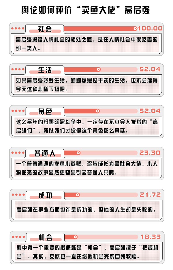 綜合輿論來看,有網(wǎng)民表示,掃黑除惡斗爭中,一定存在不少目無法紀(jì)的“高啟強(qiáng)”們,所以觀眾才會覺得這個角色如此真實(shí),“高啟強(qiáng)”們作惡多端,理應(yīng)受到法律的制裁;有網(wǎng)民評論稱,在人情社會的大環(huán)境下,高啟強(qiáng)正是因為善于把握機(jī)會,才實(shí)現(xiàn)了身份轉(zhuǎn)變,但如果把犯罪作為通往成功的“登云梯”,那么結(jié)局一定是悲慘的;還有網(wǎng)民認(rèn)為,高啟強(qiáng)的成功是“罪惡的成功”,其身上散發(fā)的魅力是“惡之魅力”,如果利用“小人物逆襲”的故事鼓吹反派角色的“悲情魅力”,則極易模糊正義與邪惡的界限。