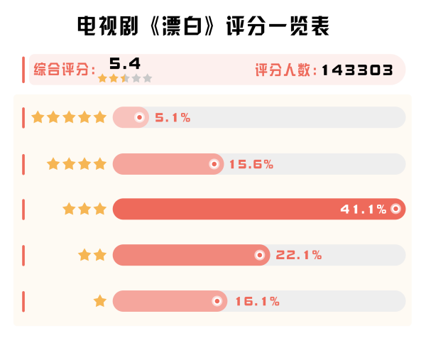 作為開年熱播劇,《漂白》的豆瓣評分從最初的6分降為5.4分。在參與評分的14萬余名觀眾中,41.1%的觀眾給出了三星,僅5.1%的觀眾給出了五星好評。跌破“及格線”的成績似乎并不理想,其中一個重要原因是該劇被指“過度美化反派”。