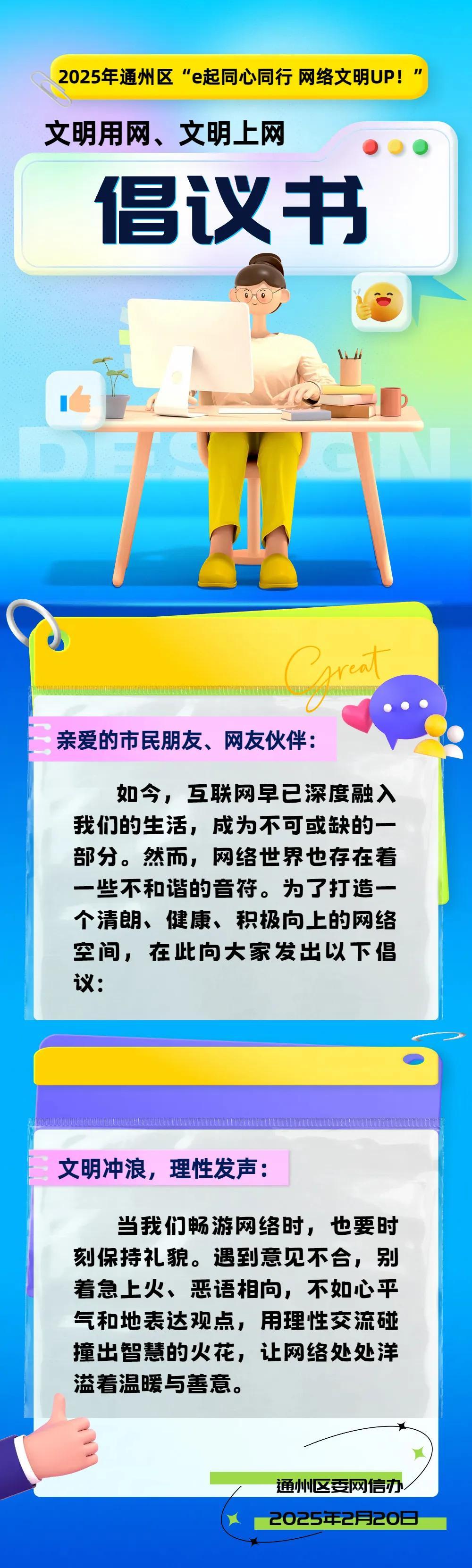 2025年通州區(qū)“e起同心同行 網(wǎng)絡(luò)文明UP!”文明用網(wǎng)、文明上網(wǎng)倡議書(shū)