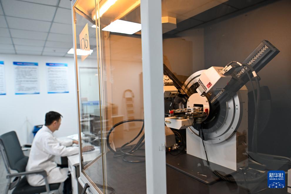 在天津陳塘科技商務(wù)區(qū)天津知微材料科技有限公司,檢測(cè)人員通過X射線多晶衍射儀進(jìn)行材料分析(3月26日攝)。