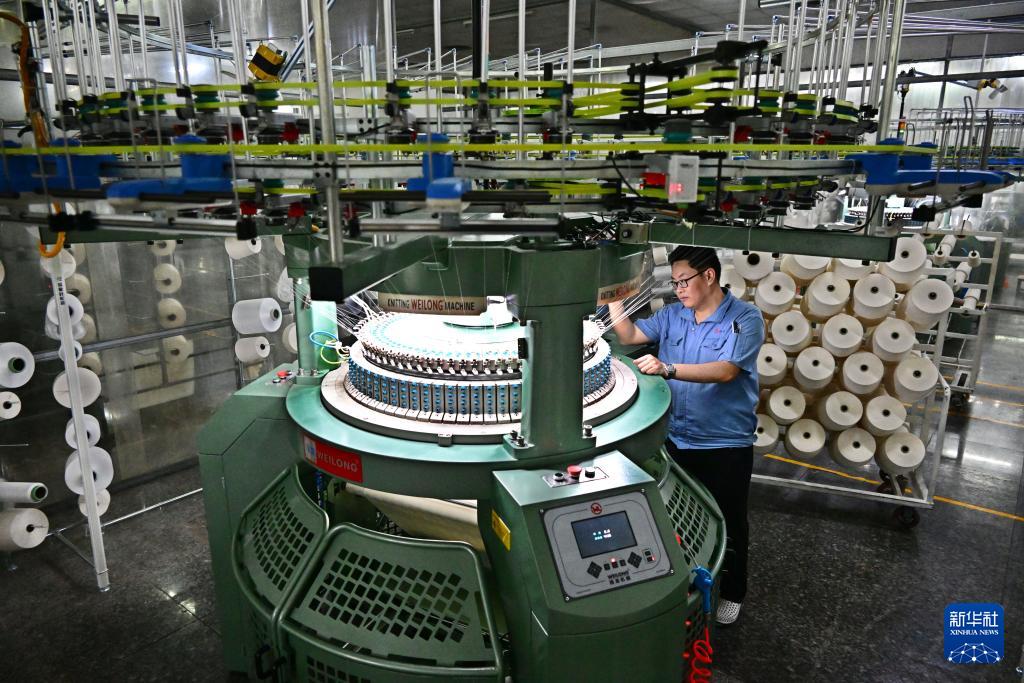 ??即墨區(qū)一家智慧紡紗企業(yè)的技術(shù)人員在維護生產(chǎn)高檔布料的自動化圓機(3月25日攝)。