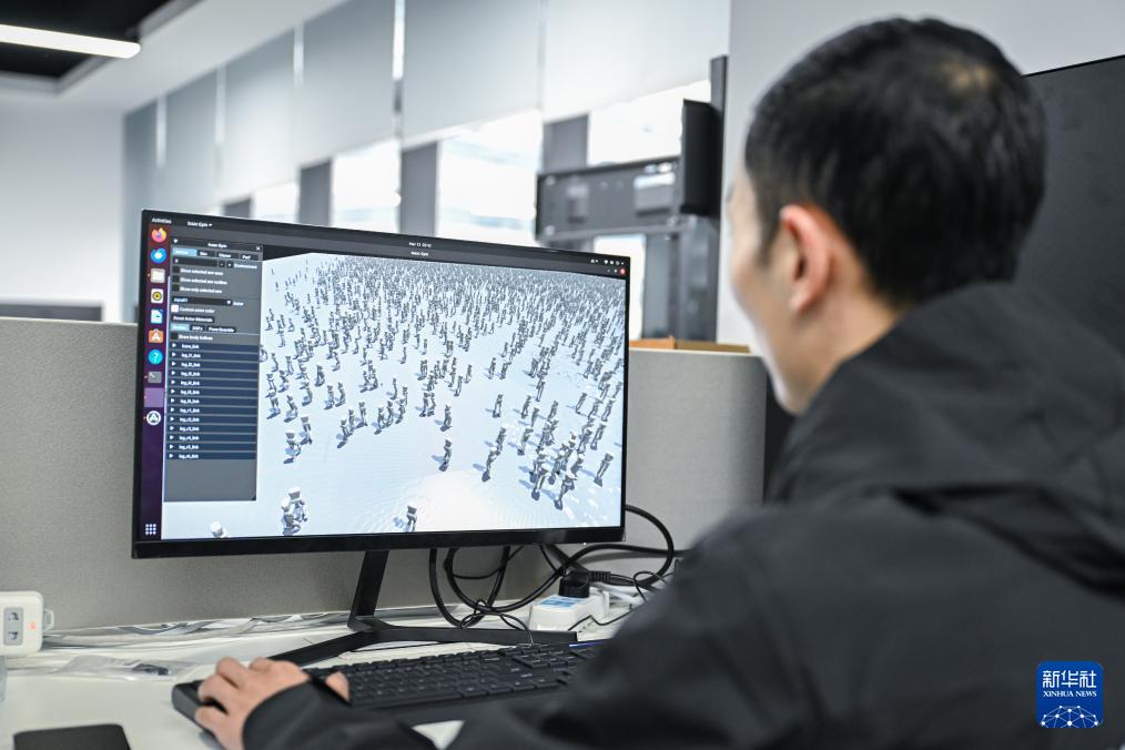??3月13日,在武漢灝存科技有限公司,工程師付龍在查看機器人動作訓(xùn)練平臺。