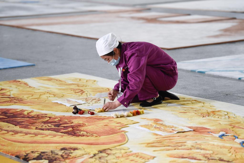 在青海圣源地毯集團(tuán)有限公司生產(chǎn)車間內(nèi),工人在制作藏毯。新華社記者 張龍 攝