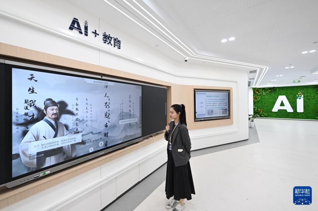 在科大訊飛天津公司,工作人員展示用于教育領(lǐng)域的AI產(chǎn)品(4月18日攝)。