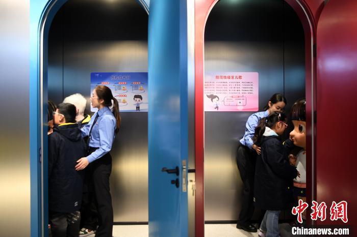 4月2日,在全國首個無障礙青少年法治教育基地,工作人員陪伴孩子在防范性侵展區(qū)了解相關(guān)知識。通過“人體紅綠燈”互動展項,可以增強(qiáng)孩子的自我保護(hù)意識。牛宏超供圖