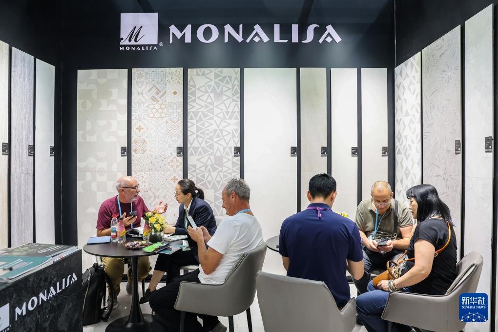 4月23日,采購商在第137屆廣交會(huì)蒙娜麗莎陶瓷展位洽談。