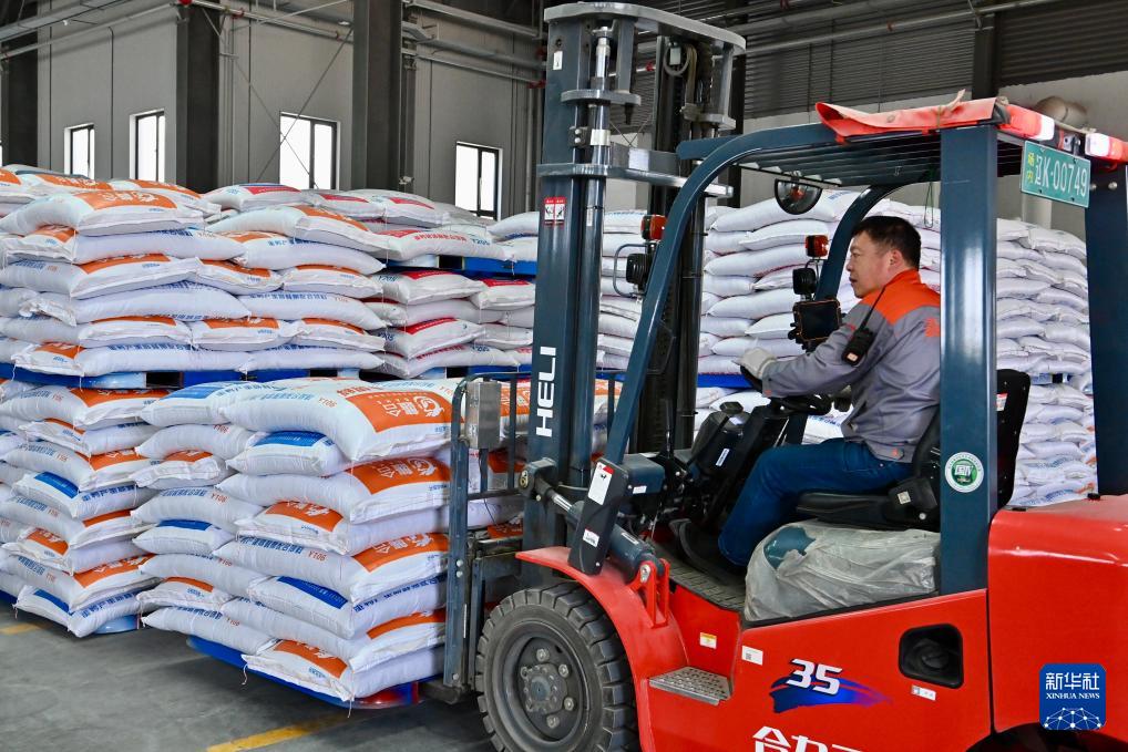 4月24日,在位于遼陽市的遼寧鑫金科技實業(yè)集團(tuán)有限公司的飼料廠內(nèi),工人使用叉車搬運飼料。