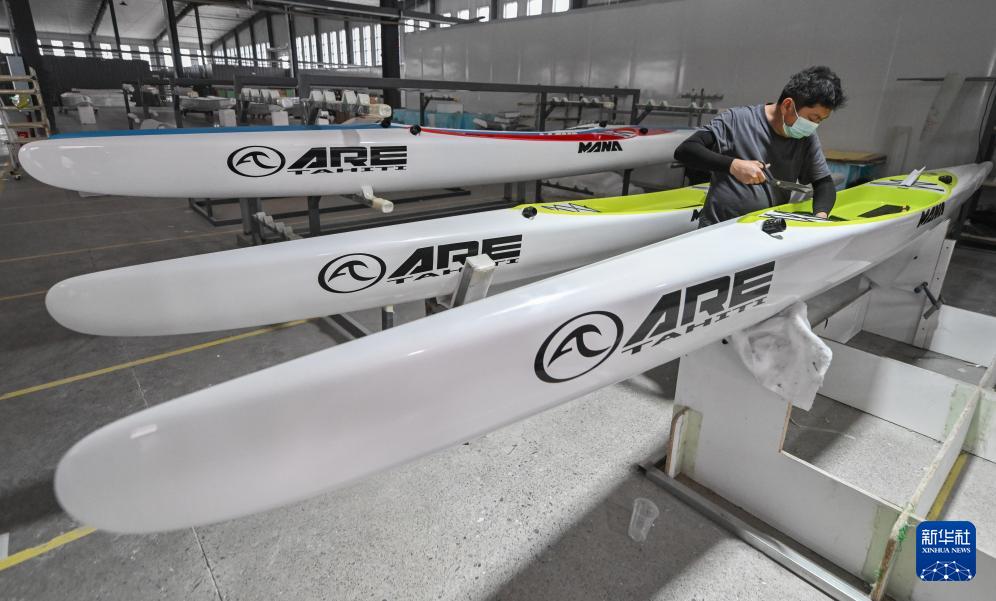 4月24日,在速力復合材料有限公司的生產(chǎn)車間內(nèi),工人在裝配海洋船。2024年,速力復材成為巴黎奧運會新增的風帆水翼賽事唯一指定生產(chǎn)商。