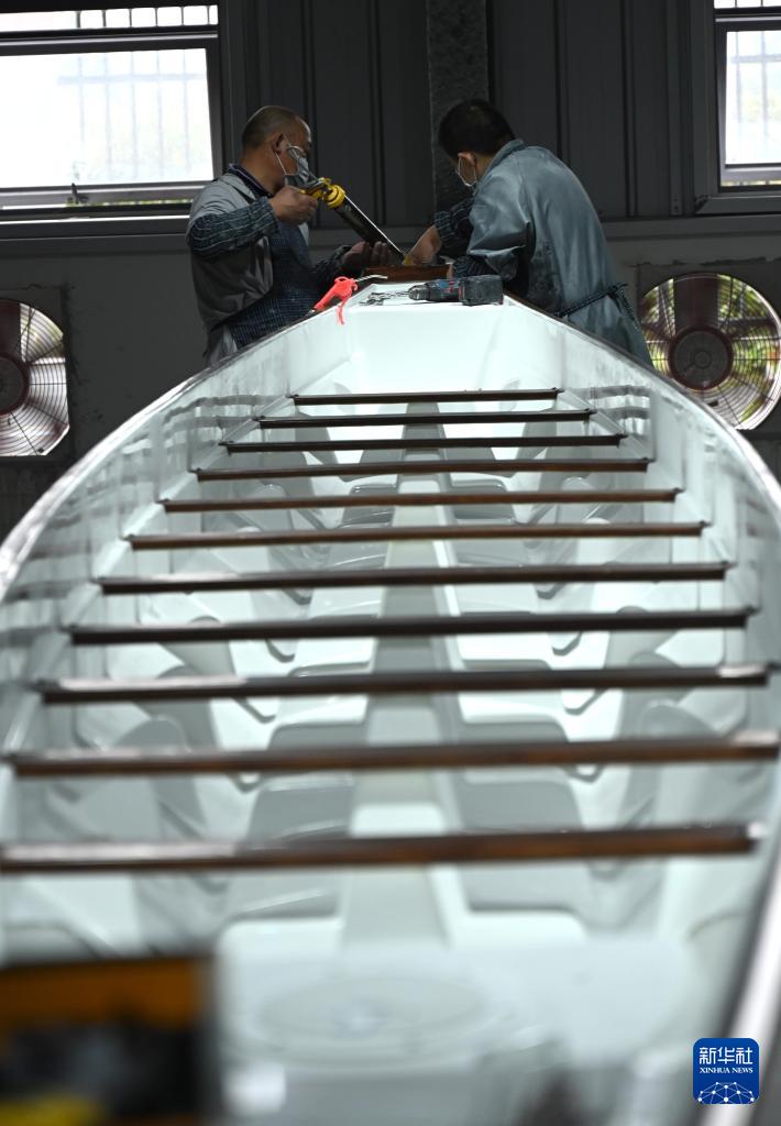 4月24日,兩名工人在速力復(fù)合材料有限公司生產(chǎn)車間龍舟生產(chǎn)線上工作。