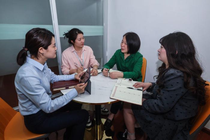 2025年4月17日,在浙江星程吉月智能科技有限公司,浙江杭州市富陽經(jīng)濟(jì)技術(shù)開發(fā)區(qū)助企服務(wù)專員(左二)、富陽農(nóng)商銀行工作人員(左一)上門解決企業(yè)融資需求。新華社記者 徐昱 攝