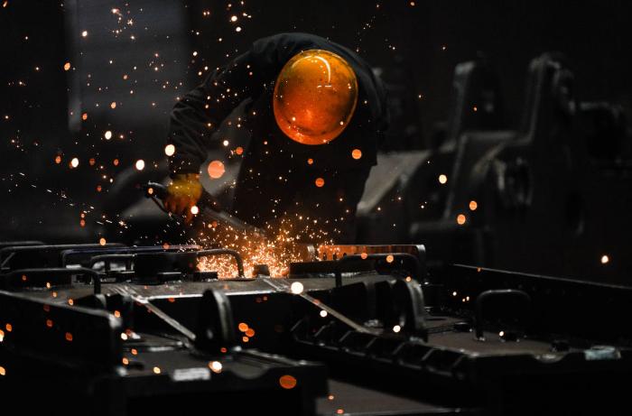 2025年3月19日,在河南省林州市紅旗渠經(jīng)濟(jì)技術(shù)開發(fā)區(qū),工人在林州重機(jī)集團(tuán)股份有限公司的鉚焊車間進(jìn)行打磨作業(yè)。新華社記者 樊雨晴 攝