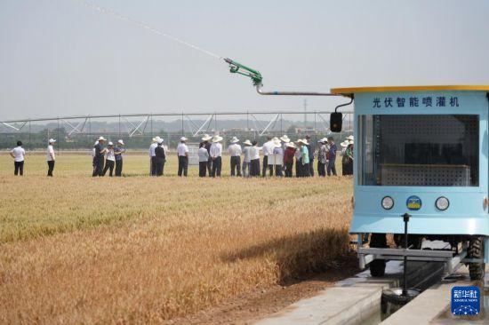 5月19日,與會(huì)人員在陜西楊凌參觀旱區(qū)農(nóng)業(yè)節(jié)水技術(shù)與裝備田間展。