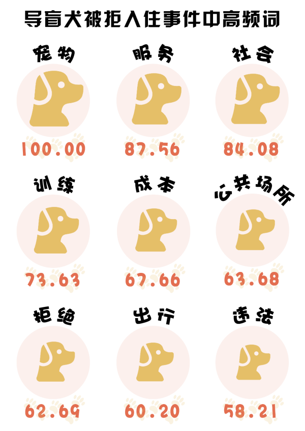 (數(shù)據(jù)來源:選取知乎話題“視障人士攜帶導(dǎo)盲犬入住全季酒店被拒,酒店的行為違法嗎?暴露出哪些問題?”下的670個(gè)回答,做分詞及歸一化處理,進(jìn)行分詞后將熱度最高的詞語規(guī)定為100)