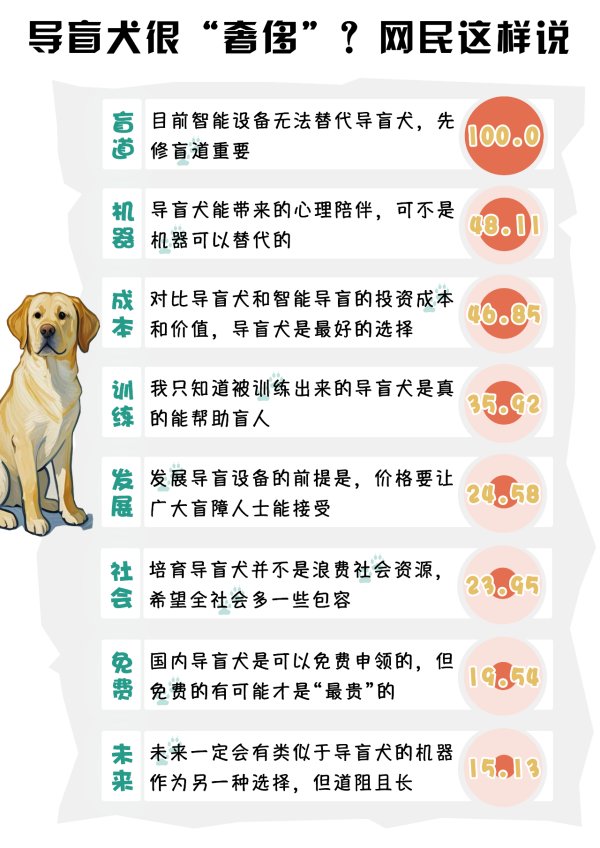 數(shù)據(jù)顯示,培訓(xùn)一條導(dǎo)盲犬的成本約20萬元,有人戲稱其是“奢侈品”。其實(shí),導(dǎo)盲犬是免費(fèi)給視障人士使用的,其養(yǎng)護(hù)、醫(yī)療等成本與寵物犬相差并不大。輿論場(chǎng)中,網(wǎng)民對(duì)于導(dǎo)盲犬的價(jià)值討論呈現(xiàn)截然不同看法。