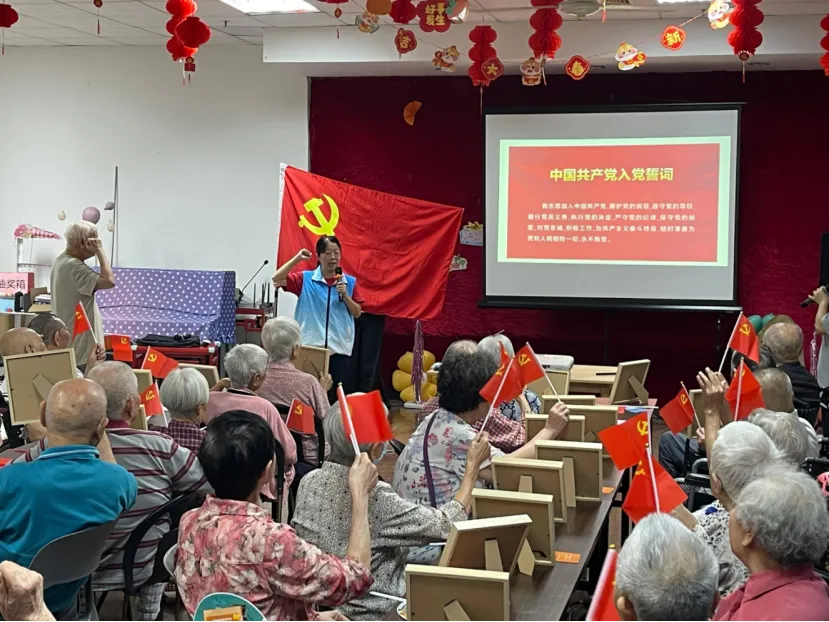 ●銘記光輝,汲取力量:活動伊始,全體黨員和長者們共同觀看了精心準(zhǔn)備的黨史短片。短片濃縮了黨波瀾壯闊的104年奮斗歷程,展現(xiàn)了共產(chǎn)黨人矢志不渝的初心使命和改天換地的偉大成就。在黨史光輝的映照下,大家共同追憶崢嶸歲月,感悟信仰力量,為后續(xù)環(huán)節(jié)奠定了深厚的情感與思想基礎(chǔ)。