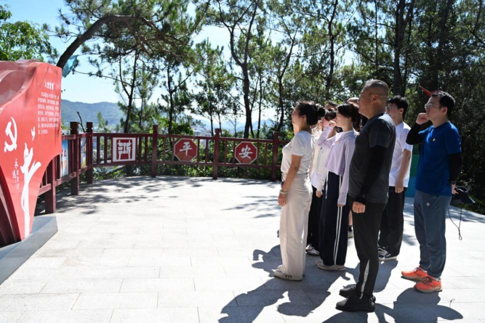 當(dāng)天上午,公園山步道入口,員工們沿著青石山道拾級(jí)而上,在司旗輕舞中,開啟紅色傳承之旅。行過百十臺(tái)階,一座由五個(gè)紅五星拱門組成的長(zhǎng)廊掩映于青山綠翠間,百年黨史濃縮在長(zhǎng)廊兩邊紅色飄帶形狀的黨建墻之上。一行人如同穿梭于時(shí)光隧道,經(jīng)過“1921石庫(kù)門”“1934長(zhǎng)征門”“1949解放門”“1978幸福門”最終到達(dá)“2021復(fù)興門”。沿途,大家不時(shí)駐足,認(rèn)真閱讀紅墻上記載的從黨的一大至十九大會(huì)議的歷史沿革,學(xué)習(xí)感悟紅船精神、長(zhǎng)征精神、紅巖精神、遵義會(huì)議精神、抗美援朝精神以及抗洪、抗震、抗疫等黨的各個(gè)時(shí)期所體現(xiàn)的革命精神和自強(qiáng)不息的奮斗精神。行程中,面對(duì)莊嚴(yán)的入黨誓詞墻,黨員們重溫入黨誓詞儀式。站在觀景平臺(tái)遠(yuǎn)眺,員工們感慨于新農(nóng)村建設(shè)欣欣向榮的景象,找尋著綠色映襯下遠(yuǎn)處甬城的最高樓,深切體會(huì)到“美好生活”背后承載的錚錚諾言和肩負(fù)的責(zé)任。