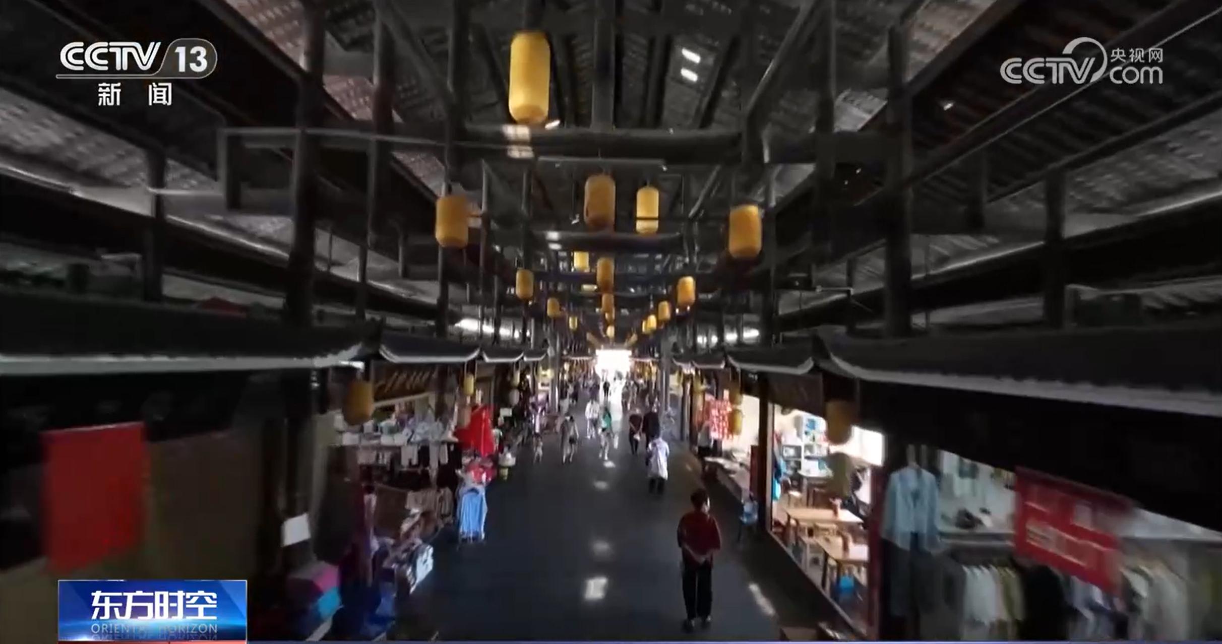 跟隨無人機(jī)的視角穿過湖南芷江,龍津風(fēng)雨橋如一條巨龍橫跨?水河,它全長246.7米、寬12.2米。這座風(fēng)雨橋橋墩形似“龍口噴津”,龍津橋因此而得名。龍津橋上,三重檐的廊道與五重檐的亭閣錯(cuò)落有致,深藍(lán)色琉璃瓦與白色檐口相映成趣。