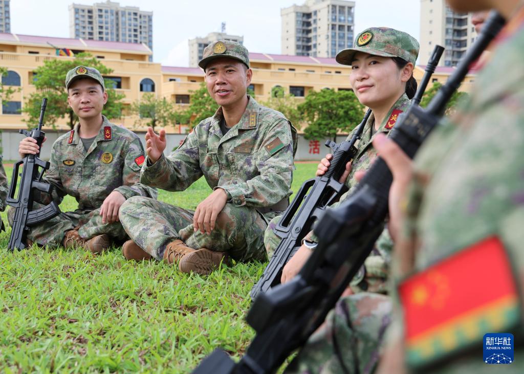 廣西軍區(qū)某部謝亮(左二)與參訓(xùn)民兵談心交流(資料照片)。 新華社發(fā)(梁凱昌攝)