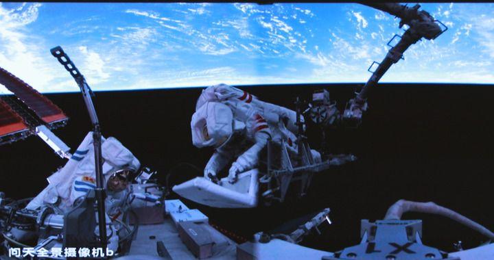 這是2025年6月26日在北京航天飛行控制中心屏幕上拍攝的神舟二十號(hào)航天員陳冬(左)與陳中瑞在空間站組合體艙外工作的畫面。新華社發(fā)(周柯毅攝)