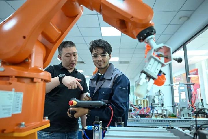6月16日,在天津現代職業(yè)技術學院魯班工坊實訓教室,教師指導學生操作設備。新華社記者 孫凡越 攝