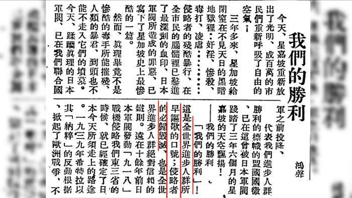 1945年9月9日出版的《星洲日報》與《總匯報》聯(lián)合版刊登《我們的勝利》的文章。圖片來源:新加坡國立大學官網(wǎng)