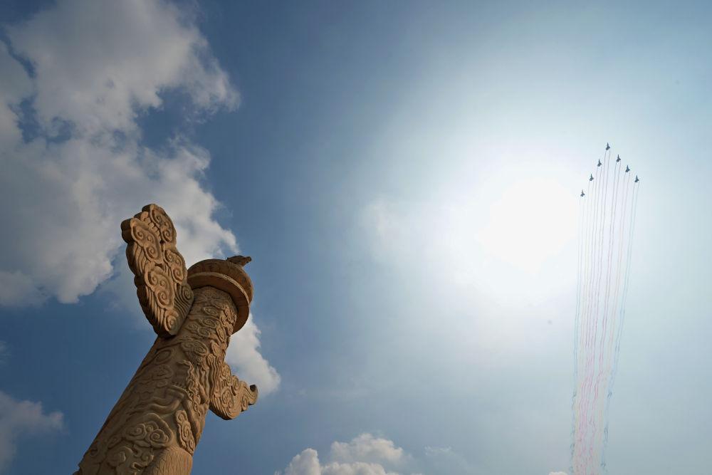 9月3日,紀(jì)念中國(guó)人民抗日戰(zhàn)爭(zhēng)暨世界反法西斯戰(zhàn)爭(zhēng)勝利80周年大會(huì)在北京隆重舉行。這是教練機(jī)梯隊(duì)接受檢閱。新華社記者 陳曄華 攝
